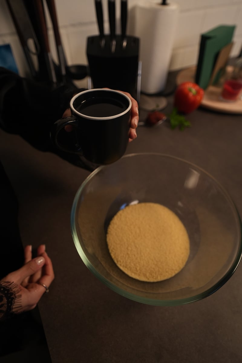 Couscous und 1 TL Salz in eine große Schüssel geben, mit heißem Wasser übergießen, abdecken und 10–15 Minuten quellen lassen.