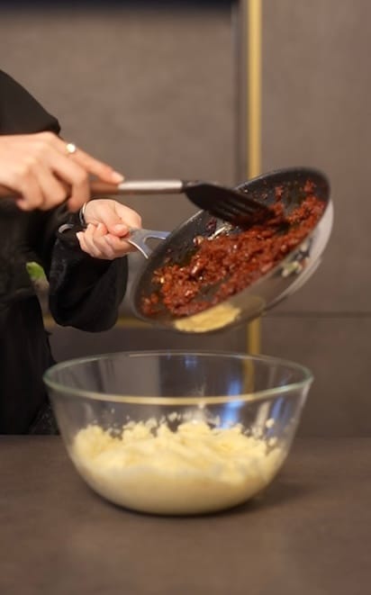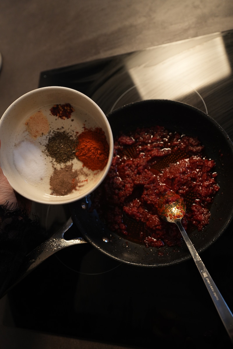 Paprika- und Tomatenmark mit den Gewürzen kurz anrösten, bis die Paste intensiv duftet und dunkler wird. Dieser Schritt verstärkt die Aromen und gibt dem Kısır seine typische Tiefe.