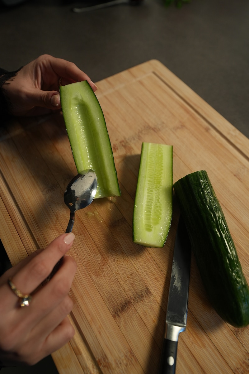 Gurke entkernen (so bleibt der Salat später saftig, aber nicht wässrig) und fein würfeln.